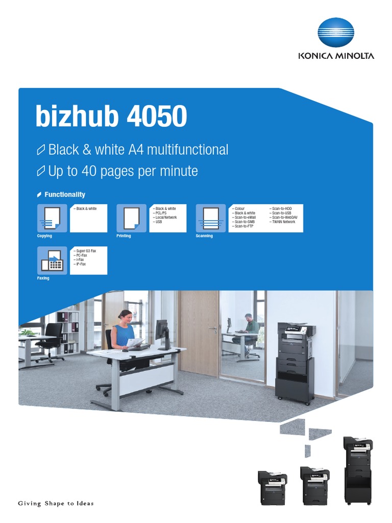 The download center of konica minolta! Standard emperon print regulator with pcl 6c, postscript 3, pdf 1.7 and xps uphold. How to install the driver for konica minolta bizhub 4050. Just download the konica minolta bizhub 4050 mfp postscript driver 1.0.0.0 driver and start the installation (keeping in mind that the konica minolta device must be at the same time connected to the computer). Instant quote on the bizhub the konica minolta bizhub is a small, mono, laser, multifunctional printer.